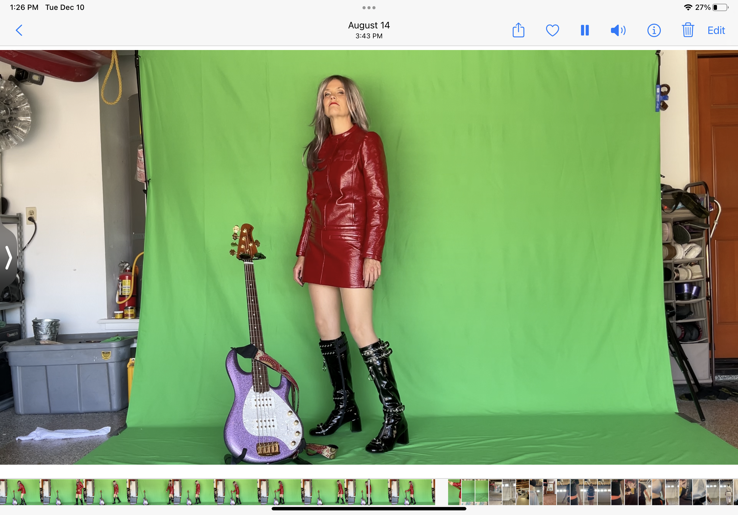 Ann Strieby, front woman of Single Note Girl, in red leather outfit and black boots standing with a purple electric guitar against a green screen backdrop.