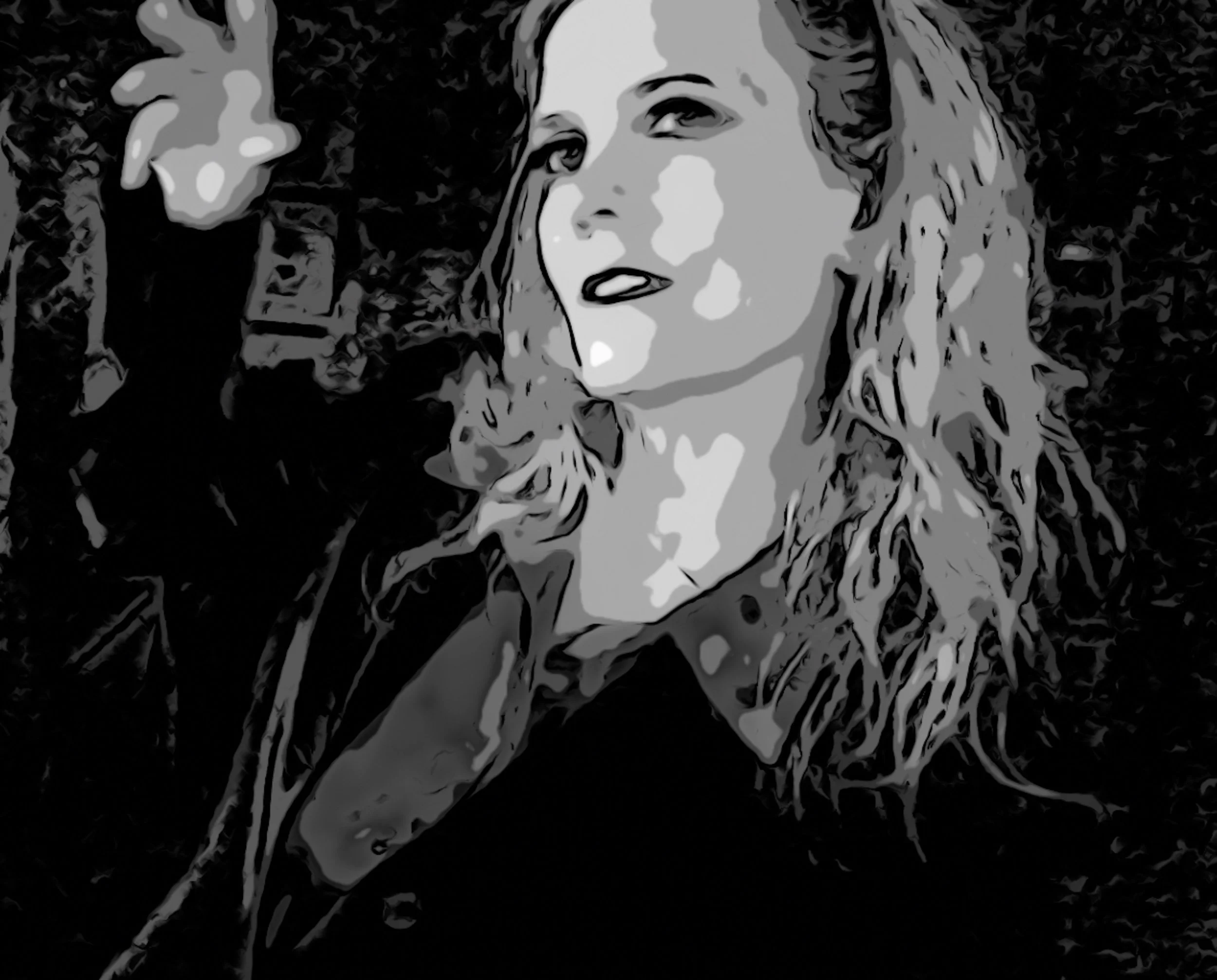 Stylized black and white portrait of Ann Strieby, front woman of Single Note Girl, with long hair, reaching upward with one hand, dramatic lighting and shadow effects.